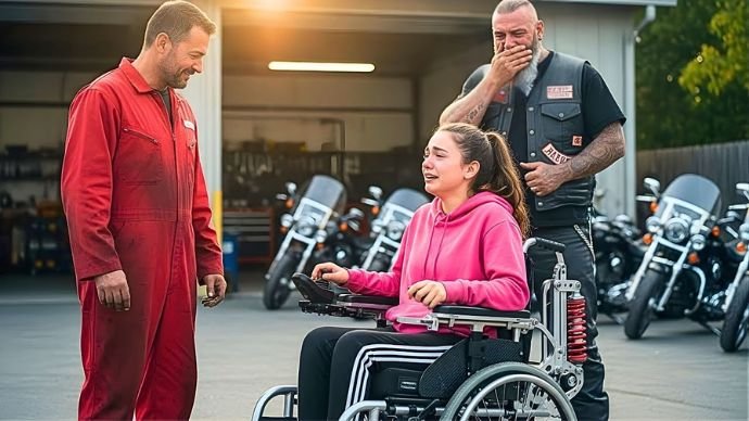 Was folgte, war eine Revolution. Der erste Tag begann sofort. Jake reparierte Marcus’ Rollstuhl. Als Marcus schmerzfrei rollte, schenkte er Jake seine Erkennungsmarken. Am dritten Tag kamen LKW-Ladungen mit neuer Ausrüstung. Die Biker installierten Licht, Hebebühnen und Werkzeug. Sie blieben und lernten von Jake. Die Garage wurde zu einem Gemeinschaftszentrum. Am fünften Tag standen Veteranen Schlange. Jake arbeitete 16 Stunden am Tag, angetrieben von reinem Sinn. Am siebten Tag geschah das Wunder. Jake arbeitete unter einem Stuhl, als er Sophies Stimme hörte. „Jake, schau mal.“ Er rollte hervor. Sophie stand. Sie benutzte einen von Jake modifizierten Rollator, aber sie stand aufrecht und ging. Fünf Schritte. „Der Stuhl hat geholfen“, sagte sie unter Tränen. „Er hat meinem Körper Raum zum Heilen gegeben. Die Schwellungen sind weg. Ich kann wieder laufen.“