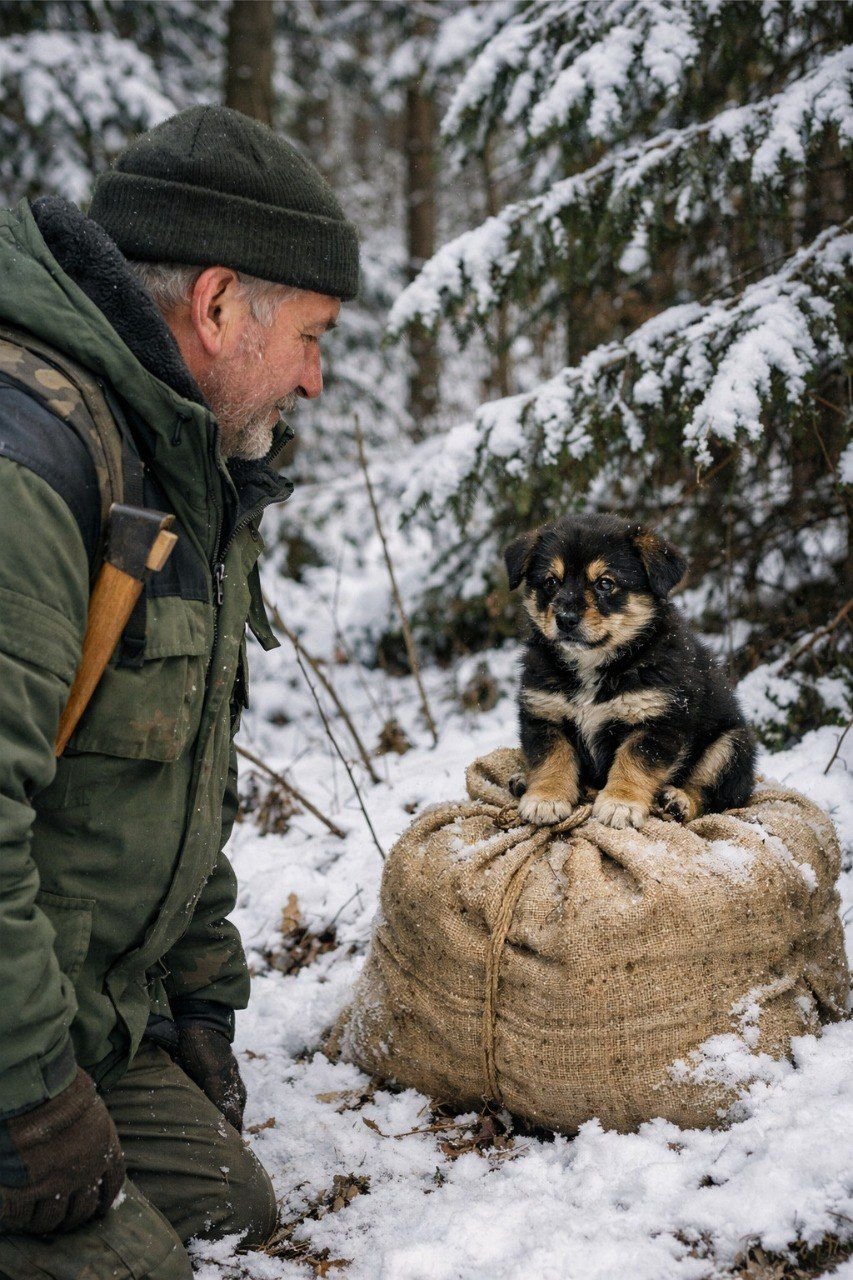 Der Welpe kroch sofort näher, drückte seine feuchte Nase an den Rand des Sacks und prüfte mit einem leisen Wimmern, ob das, das er bewachte, noch lebte. In dieser kleinen, schmerzerfüllten Stimme lag so viel Verzweiflung, dass dem Förster Tränen in die Augen stiegen.