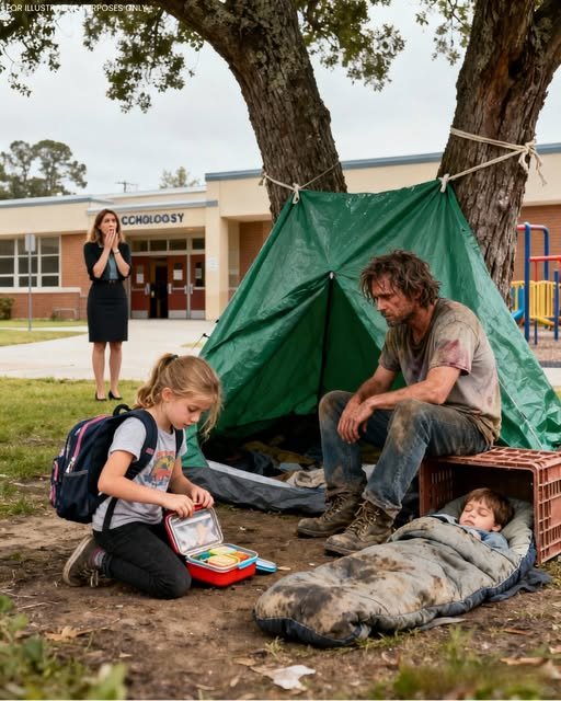 Als sie eine Lichtung erreichte, sah ich einen provisorischen Unterschlupf, der aus einem ramponierten Campingzelt, mehreren Planen und etwas aussah, das wie weggeworfenes Sperrholz aussah. Ein Mann saß neben dem Tierheim, den Kopf in den Händen vergraben. Auf einer Decke in der Nähe lag ein kleiner Junge, gerötet und unruhig im Schlaf.