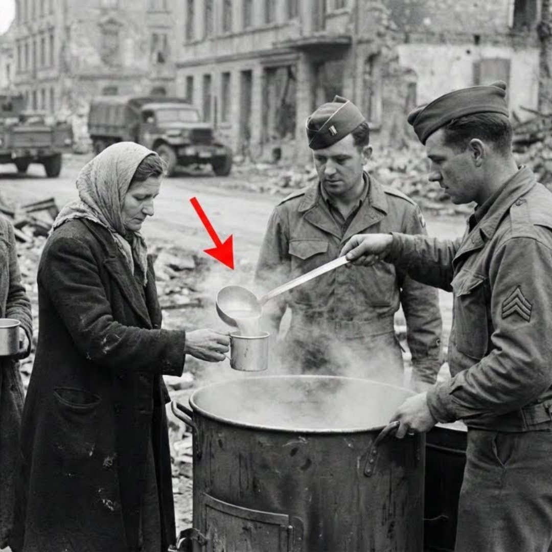 Dampf steigt aus großen Metalltöpfen auf. Amerikanische Soldaten bewegen sich mit ruhiger Routine. Sie heben Schöpfkellen. Sie gießen dicke Suppe. Die Frau schaut schweigend zu. Ihr Magen zieht sich zusammen, nicht nur vor Hunger, sondern auch vor Unglauben. Seit Monaten lebt sie von Schrott. Aufschlagschalen, dünnes Brot gemischt mit Füllstoffen. Jetzt kräuselt sich der Dampf in den grauen Himmel, schwer von Fett und Fleisch.